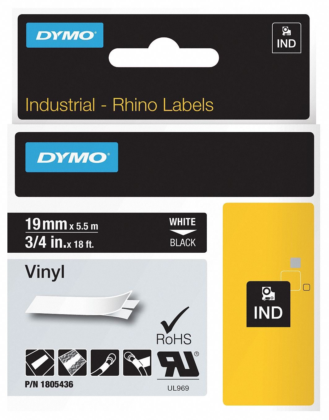 Dymo Rhino Industrial Vinyl Labels - 3/8" Width x 18 ft Length - Permanent Adhesive - Rectangle - Thermal Transfer - White - Vinyl - 1 Each - Scratch ...
